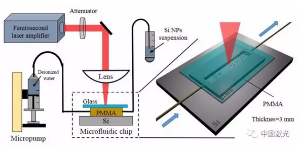 右側(cè)為制備完成的微流控芯片(藍(lán)色箭頭為微流體流動(dòng)方向),左側(cè)為實(shí)驗(yàn)所用光路。激光經(jīng)過物鏡聚焦在微通道硅基上,制備完成的納米材料會(huì)被微流體“帶離”微流體芯片。