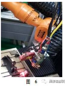 在批量生產(chǎn)過(guò)程中,因產(chǎn)品自身焊縫位置的偏離,即使焊接初始點(diǎn)校對(duì)再準(zhǔn)確,仍存在焊偏、漏焊的現(xiàn)象,因此增加了激光焊縫跟蹤系統(tǒng)。激光焊縫跟蹤系統(tǒng)通過(guò)激光視覺(jué)傳感器檢測(cè)焊縫運(yùn)動(dòng)軌跡,利用圖像處理軟件計(jì)算出焊縫偏差,然后將偏差傳送給機(jī)器人控制系統(tǒng),從而控制機(jī)器人帶動(dòng)焊接頭移動(dòng)到正確位置進(jìn)行焊接。圖6為激光焊縫跟蹤系統(tǒng)工作狀態(tài)。