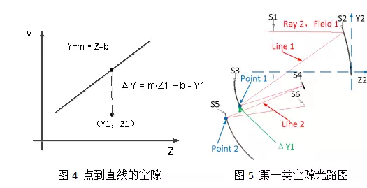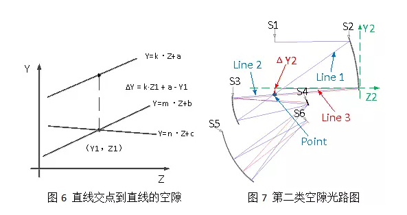 第二類空隙是指某視場上、下邊緣光線的交點到某邊緣光線的距離。如圖6所示,兩條相交直線的方程為Y=m·Z+b和Y=m·Z +c,另外一條直線的方程為Y=k·Z+a,交點坐標為(Y1,Z1),則交點到直線的空隙為ΔY。