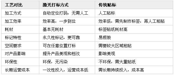 采用激光方式將原有塑料標(biāo)簽整體替換為激光標(biāo)記,加工方式由傳統(tǒng)的人工貼標(biāo)改為激光自動(dòng)打標(biāo),可提高生產(chǎn)效率、節(jié)省人力和大量耗材的同時(shí),也更加環(huán)保高效。