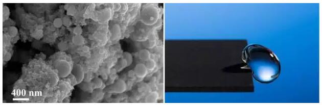 圖 8 飛秒激光在金屬表面刻蝕出的層次結(jié)構(gòu),水珠從被該技術(shù)處理過的樣品表面上滑落