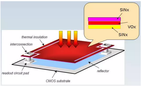 熱敏層材料的選取對(duì)于微測(cè)輻射熱計(jì)的靈敏度(NETD)有非常大的影響,目前最為常用的熱敏材料包括氧化釩(VOx)和多晶硅(a-Si)兩類,相應(yīng)的非制冷紅外焦平面探測(cè)器也據(jù)此分成了兩大技術(shù)陣營(yíng)。