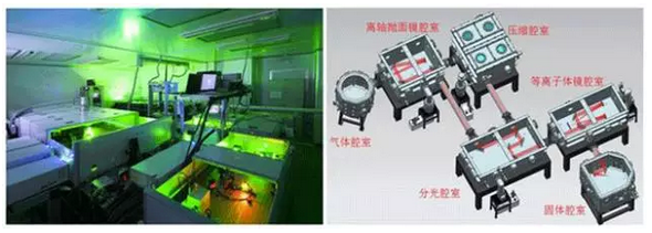 圖2 實(shí)驗(yàn)系統(tǒng):左圖為200TW激光系統(tǒng);右圖為靶場(chǎng)示意圖。(圖片來(lái)源:上海交通大學(xué)激光等離子體實(shí)驗(yàn)室)
