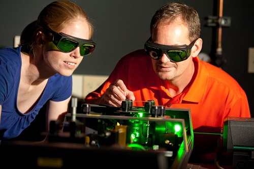 John Ballato教授和他的學(xué)生正在調(diào)整用于該研究的激光器。照片來源:John Ballato/美國克萊姆森大學(xué)(Clemson University)。
