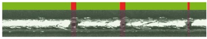激光釬焊縫在白車身生產(chǎn)中經(jīng)常用作風(fēng)格元素。在上漆之后,它們對(duì)于最終用戶是直接可見(jiàn)的,使得焊縫表面的氣孔是不可接受的焊縫缺陷。因此,檢測(cè)這些焊縫缺陷是非常重要的。由于大部分氣孔在表面上是開(kāi)口的,它們會(huì)在明亮的照明焊縫上成為黑點(diǎn)。例如通過(guò)斑點(diǎn)檢測(cè),這樣的黑點(diǎn)似乎是顯而易見(jiàn)的。但這種方法并不能令人滿意,因?yàn)槠淙Q于閾值和實(shí)際照明情況。更理想的一種方法是使用基于分類的氣孔檢測(cè),如[2]所示。專門的圖像特征被用于將固化焊縫分類為有缺陷或無(wú)缺陷的部分。強(qiáng)度的平均值和標(biāo)準(zhǔn)偏差以及梯度圖像用于分類。通過(guò)FPGA技術(shù),對(duì)有缺陷和無(wú)缺陷的部分的修整值進(jìn)行比較,從而可以在實(shí)時(shí)配置中判斷焊縫質(zhì)量??梢允褂眠@種方法檢測(cè)直徑從幾百微米到幾毫米的氣孔。結(jié)果在全景圖像中是可見(jiàn)的,如圖4所示;氣孔被標(biāo)記為紅色,而焊縫的無(wú)缺陷部分被標(biāo)記為綠色。
