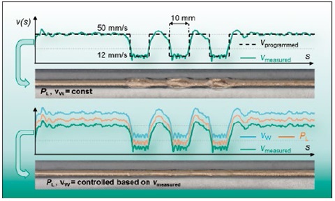 在激光釬焊的情況下,激光功率PL以及填充焊絲的速度vW需要根據(jù)測(cè)量的速度按比例調(diào)整[5]。受控激光釬焊的結(jié)果如圖5所示。該系統(tǒng)在工藝條件下通過(guò)對(duì)法蘭接頭結(jié)構(gòu)的釬焊進(jìn)行了測(cè)試。在實(shí)驗(yàn)中,速度在3至0.72米/分鐘的范圍內(nèi)變化。盡管該變化范圍很大,受控釬焊過(guò)程仍然保持穩(wěn)定,并且引導(dǎo)機(jī)器人系統(tǒng)的速度波動(dòng)得到補(bǔ)償。此外,焊縫表面實(shí)現(xiàn)了平滑而且?guī)缀蹙鶆虻墓鈱W(xué)外觀。人們可以想到的一個(gè)相關(guān)應(yīng)用是行李箱蓋的焊接,其中由于工件的幾何形狀,釬焊過(guò)程中激光頭需要重新對(duì)準(zhǔn),在光學(xué)器件繞著銘牌的突出部分的邊緣轉(zhuǎn)動(dòng)時(shí),釬焊速度會(huì)下降到較低值。
