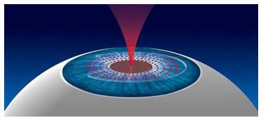 利用超精細(xì)與無熱效應(yīng)兩個特點,超快激光可充當(dāng)“微創(chuàng)”手術(shù)刀, 進(jìn)行視力矯正和白內(nèi)障等眼科疾病治療,使手術(shù)更精確、更安全, 其關(guān)鍵作用為:飛秒脈沖激光聚焦到角膜組織內(nèi)時,由于其超高的峰值功率而產(chǎn)生光爆破,從而產(chǎn)生大量的微離子。每一個微離子可以蒸發(fā)大約1微米的角膜組織,伴隨產(chǎn)生擴展的水泡和CO2氣泡,這些水泡和氣泡不斷被角膜組織吸收,從而在角膜組織中形成一層微小直徑的氣泡,使角膜組織分離,形成相應(yīng)的分離面,也就是飛秒激光的切削面。