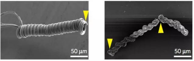 至于處于這兩條線之間的激光,其功率則可以成功的讓蜘蛛絲半融化,體積稍微擴(kuò)大一圈;在照射偏離中心的位置時(shí),還能讓蜘蛛絲進(jìn)行彎曲。通過(guò)對(duì)照射時(shí)間的控制,研究人員們可以精準(zhǔn)控制彎曲的具體度數(shù)。目前,他們已經(jīng)用蜘蛛絲成功做出了螺線管、彈簧、以及復(fù)雜的結(jié)扣。