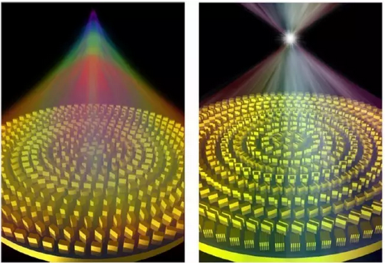 目前,人們已經(jīng)展示了利用超構(gòu)表面研制的平板超構(gòu)透鏡(百納米量級厚度)可以媲美傳統(tǒng)光學(xué)顯微鏡鏡頭的成像效果。不過,此類新原理設(shè)計(jì)真正走向應(yīng)用還面臨幾項(xiàng)重要挑戰(zhàn),材料色散及衍射效應(yīng)導(dǎo)致的色差就是其中之一。