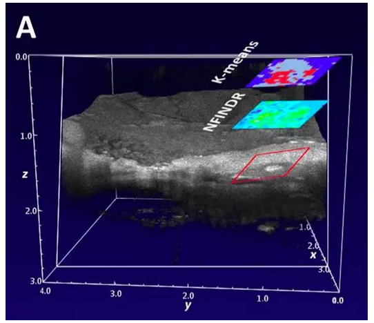 除此之外,光學(xué)相干斷層成像(OCT)領(lǐng)域在近期也有新的進(jìn)展。例如,來(lái)自愛(ài)爾蘭國(guó)立高威大學(xué)的M. Leahy教授團(tuán)隊(duì),從傳統(tǒng)的多參數(shù)OCT顯微圖像中得到了相位信息,這給傳統(tǒng)OCT圖像的分析提供了新的維度。德國(guó)耶拿大學(xué)的J. Popp教授團(tuán)隊(duì)將拉曼光譜成像和OCT成像技術(shù)結(jié)合起來(lái),用來(lái)分析動(dòng)脈粥樣硬化的血小板分布情況(下圖)。