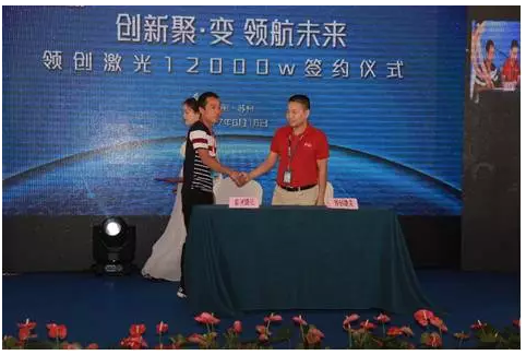 萬瓦新品發(fā)布會后,隨即就引起巨大反響。泰州騰達(dá)激光董事長周偉先生決定當(dāng)場購買領(lǐng)創(chuàng)激光的12000W設(shè)備并現(xiàn)場與領(lǐng)創(chuàng)激光簽訂購買合約,此次合同的簽訂也是我國國內(nèi)第一臺12000W激光設(shè)備的成交記錄。