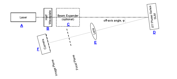 A:532nm 連續(xù)激光器;B:半波片;C:望遠(yuǎn)系統(tǒng);D;P1920-0532液晶空間光調(diào)制器;E:f=75mm透鏡;F:Basler aCA1920相機(jī)(ψ=10°)