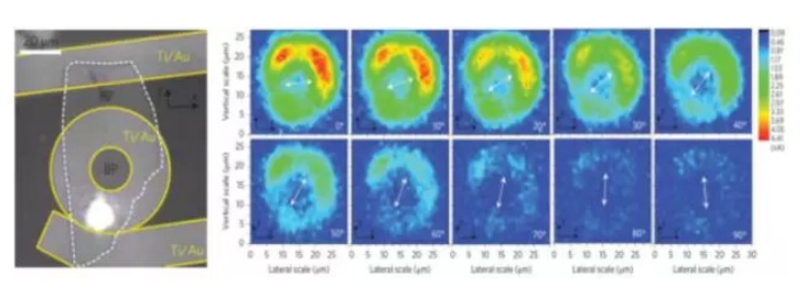 同年,斯坦福大學袁洪濤和崔屹等人將一塊黑磷薄片制作成上下垂直pn結,有效分離光生載流子,如圖3所示,同時制作一個環(huán)狀電極,消除電極/黑磷邊緣對偏振探測的干擾。結果顯示黑磷具有明顯的偏振光敏感性。