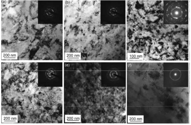 鈦合金激光沖擊在表層產(chǎn)生的納米晶層厚度約1 μm,晶粒尺寸分布為30-300 nm;鎳基高溫合金形成的納米晶層厚度為0.5-1 m,晶粒尺寸范圍為30-500 nm;沖擊1次表面納米晶分布還不均勻(圖1(a)-(c)),沖擊3-5次后,在多種金屬材料表面形成了取向隨機(jī)、等軸狀的納米晶(圖1(d)-(f))。從不同金屬材料激光沖擊表面納米化過程與特征來看,晶粒細(xì)化機(jī)制主要取決于材料本身的結(jié)構(gòu)與沖擊波參數(shù)。