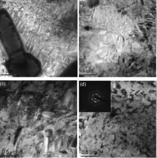 (a) 基體; (b) 高密度位錯(cuò); (c) 位錯(cuò)胞; (d) 表層納米晶