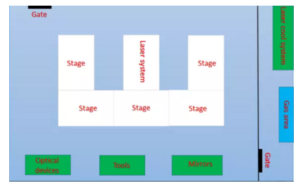 接著是另一種相對而言比較少見的布局方式,各個(gè)光學(xué)平臺(tái)之間彼此分開。這種布局方式比較適用于數(shù)量較多的小型試驗(yàn)系統(tǒng)。各個(gè)系統(tǒng)彼此分開,互不影響??拷す馄鞯钠脚_(tái)只需留出前端的一小部分作為激光傳播到后續(xù)平臺(tái)的空間即可。當(dāng)然這種方法的缺點(diǎn)也非常明顯,處于后端的實(shí)驗(yàn)平臺(tái)接收到的激光品質(zhì)會(huì)下降。如果室內(nèi)建設(shè)不達(dá)標(biāo),會(huì)對飛秒激光的脈寬影響較大。