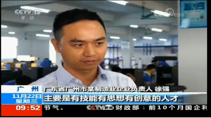 ”為解決技師學(xué)院學(xué)生就業(yè)問題,提高就業(yè)收入,也為我司帶來高新技術(shù)人才;2015年我司已與廣東省機械技師學(xué)院創(chuàng)建了校企合作班“,創(chuàng)可激光負責(zé)人徐強在接受央視采訪時提到。“我們現(xiàn)在所需要的人才,主要是有技能有思想有創(chuàng)意的人才,解決了人才問題,其他都是小事”。