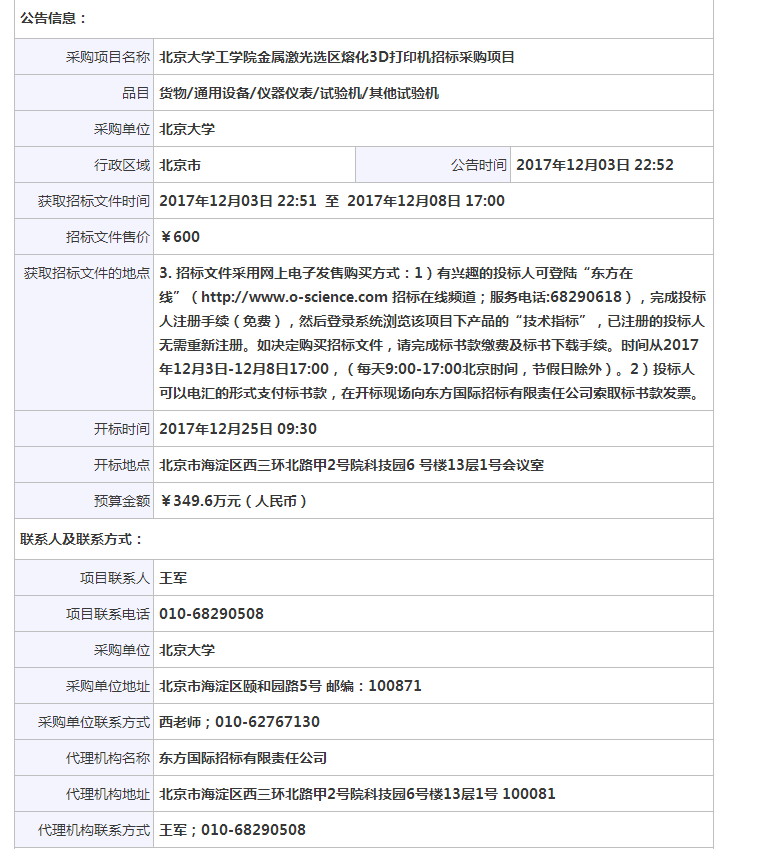 北京大學(xué)工學(xué)院金屬激光選區(qū)熔化3D打印機(jī)招標(biāo)采購項目公開招標(biāo)公告: