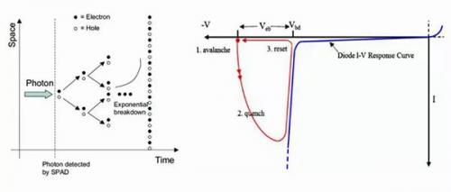 接收系統(tǒng)的主要功能是識別從發(fā)射器發(fā)出的和從物體上反射的光束。因此探測器需要非常靈敏,以至能夠探測到單個的光子。如今,最新的相關設備采用了SPAD(Single-Photon Avalanche Diode單光子雪崩二極管) 技術。