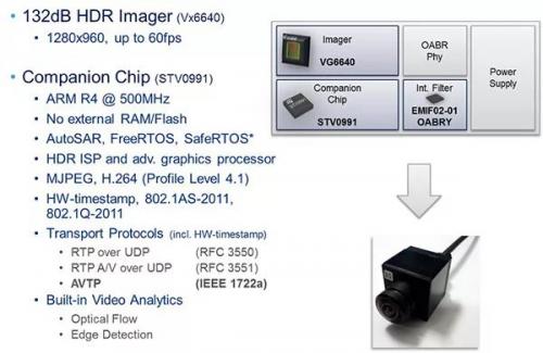這一方法使后視攝像頭能夠壓縮信息并通過以太網傳輸?shù)杰嚈C主機上。圖5顯示了一個此類高度集成化的數(shù)碼后視攝像頭的技術細節(jié)。