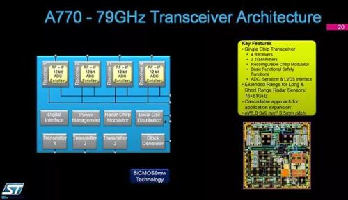 A770是一個單片集成收發(fā)器,包括了三個發(fā)射器、四個接收器、一個可調的鋸齒波發(fā)生器,一個集成的ADC(Analog to Digital Converter模數(shù)轉換器)和一個MIPI CSI II 接口。當需要更多發(fā)射和接收通道時,這一模塊甚至可以被級聯(lián)起來。模塊被封裝在9mm*9mm的陶瓷EWLB(Embedded Wafer Level Ball Grid Array內嵌式晶圓級球柵陣列)中,可以被用于中程和長程探測。
