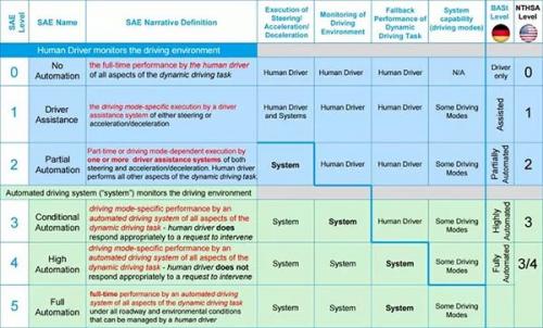對于自動駕駛的不同類別劃分已經在以下表一中列出了。這一分類在美國是基于國際工程與汽車工業(yè)協(xié)會SAE3016標準列出的,在歐洲則是聯(lián)邦高速公路研究所制定的。具體可以參考車云菌以往的文章(一篇文章讀懂NHTSA自動駕駛分級),這里不做贅述。