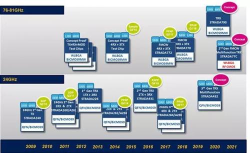 除了優(yōu)化的BiCMOS技術,意法半導體公司還能將片上系統(tǒng)通過公司自行開發(fā)的FD-SOI技術集成起來,刷制在僅有28nm厚的電路板上。圖9顯示了目前MMIC的發(fā)展過程。在24GHz頻帶范圍內的最新研發(fā)成果是A431塊,它包含了一個發(fā)射器和三個接收器。圖中的26GHz基帶元件則主要是為美國市場而開發(fā)的。