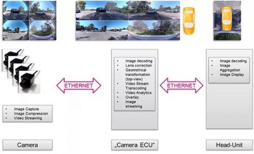 以下圖片展示了另一種方法,該方法將圖像處理過程分散在各個攝像頭上,再將處理后的數(shù)據通過Ethernet(局域以太網)傳送給汽車車機主機(包含主顯示屏控制功能的電子控制模塊),從而完成圖像的收集和顯示。單個的圖像信息在攝像頭內處理,再通過以太網接口和短延時視頻編碼器H264被送到音響主機的主處理器中。圖2展示的是未來車載攝像頭系統(tǒng)從模擬信號向數(shù)字信號發(fā)展的過程。