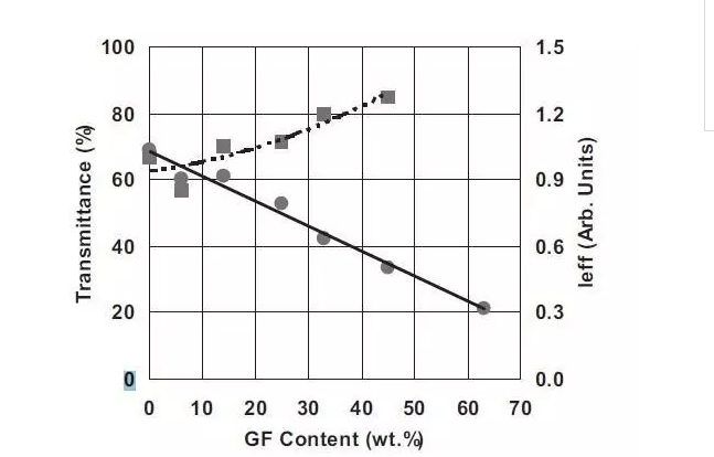 對于填充型聚合物材料來說,光學(xué)性能受到填充材料的影響較大。以玻纖為例,Val Kagan研究了不同玻纖含量的PA6增強樹脂的透過率(圖3),發(fā)現(xiàn)隨著玻纖含量的增加,材料的透過率是線性下降的。