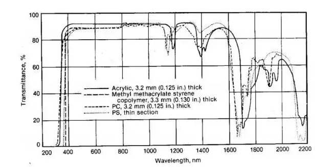 根據(jù)上文所述,聚合物在近紅外區(qū)具有較高的透過率,因此在選擇上靈活性較大。在車燈上,作為透過層的配光鏡常選擇可見光區(qū)透光率也比較高的PC或PMMA。