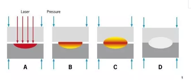 激光焊接是利用高能量密度的激光束作為熱源的一種焊接方法,即激光輻射加熱工件表面,表面熱量通過熱傳導(dǎo)向內(nèi)部擴散,使工件熔化,形成特定的熔池。因此,激光光束的能量必須被塑料吸收,才能達到良好焊接效果(如圖1所示)。