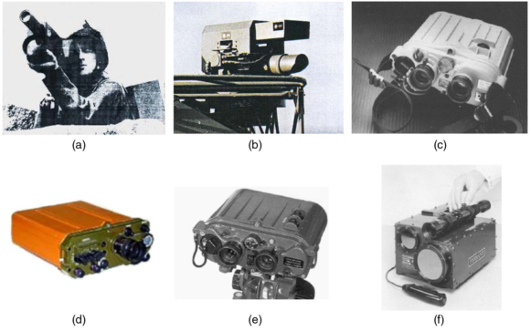 圖9. 早期激光測距儀的發(fā)展示例.(a)第一臺愛立信LRF試驗設(shè)備(1965年);(b)瑞典海軍用LRF(1968年);(c)西姆拉德手持LP-7;(d)LRF KTD 2-2(極地, USSR);(e)LRF BD-1 (801研究所, USSR);(f)費(fèi)朗蒂CO2 TEA LRF.