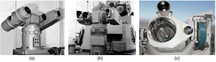 圖10. 帶激光雷達(dá)的FSU電光系統(tǒng)。 (a)海軍激光雷達(dá)系統(tǒng)(基輔)的兩個甲板裝置之一,(b)具有激光雷達(dá)監(jiān)視和消防控制系統(tǒng)(基輔)的多通道CM,(c)精密測距和角度測量 系統(tǒng)(阿爾泰光學(xué)激光中心)。