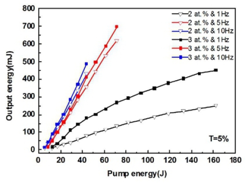 圖4.不同頻率和泵浦功率下2at.% Cr,Er:YSGG和3at.% Cr,Er:YSGG晶體的激光輸出