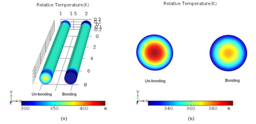 圖2.Cr,Er,Pr:GYSGG和鍵合GYSGG/Cr,Er,Pr:GYSGG激光棒的熱分布。(a)晶體棒表面的熱分布;(b)鍵合面位置的熱分布。