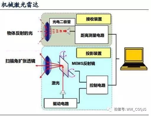 機械激光雷達由光電二極管、MEMS反射鏡、激光發(fā)射接受裝置等組成,其中機械旋轉(zhuǎn)部件是指圖中可360°控制激光發(fā)射角度的MEMS發(fā)射鏡。