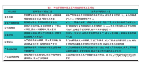激光拼焊板在汽車產(chǎn)品上應(yīng)用后,有效提高了整車的各項(xiàng)性能,并且在降低制造成本方面具有顯著的優(yōu)勢。采用激光拼焊板與傳統(tǒng)零部件產(chǎn)品制造工藝對比,其優(yōu)勢,如表1 所示。