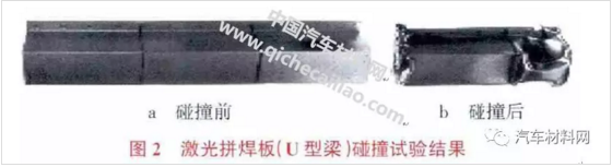 為驗(yàn)證產(chǎn)品結(jié)構(gòu)性能,對由3 塊不同強(qiáng)度的鋼板沖壓成U 型梁的激光拼焊板進(jìn)行碰撞試驗(yàn),如圖2 所示。要求發(fā)生碰撞時兩端潰縮吸能,中間保持原有形狀。從圖2 可以看出,碰撞后按照設(shè)計(jì)要求兩端潰縮吸收撞擊能量,中間基本無變形。