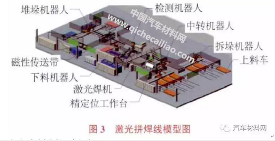 生產(chǎn)設(shè)備主要由三部分組成。1)傳輸裝置:包括上料車、拆垛機(jī)器人、中轉(zhuǎn)機(jī)器人、下料機(jī)器人、磁性傳送帶、打淺坑裝置及堆垛機(jī)器人;2)激光焊接設(shè)備:包括定位工作臺及激光焊機(jī);3)檢測設(shè)備:包括在線無損檢測設(shè)備及檢測機(jī)器人。圖3 示出激光拼焊線模型圖。