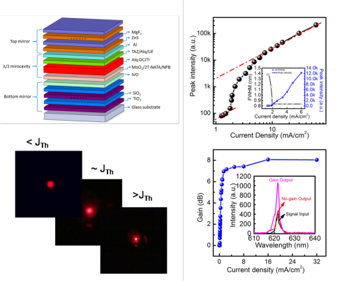 圖2.電泵浦有機激光器件的閾值及光放大特性