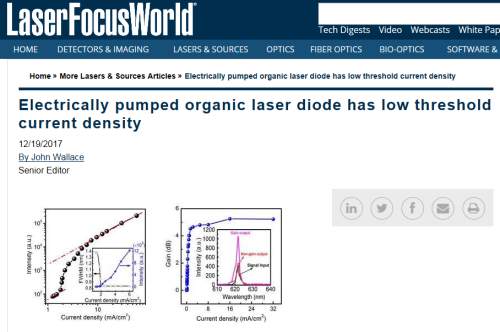 Laser Focus World的高級主編John Wallace評價該工作,“該低閾值激光器的實現(xiàn)意味著室溫、連續(xù)激射的可行性,是有機半導體激光器獲得實際應用的重要一步。”此外,該激光器極低閾值電流密度顛覆了人們對有機半導體激光的認識,表明高品質因子微腔中的有機Frankel激子的激發(fā)態(tài)性質以及相關的受激發(fā)射過程發(fā)生很大變化。開展上述物理過程的基礎研究將使人們對有機半導體材料的激發(fā)態(tài)過程有更深入的理解和認識,有助于推動有機半導體的發(fā)展,催促全新型有機光電子器件的產生和廣泛應用。