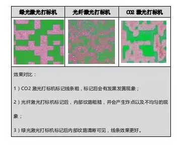3)綠光激光打標(biāo)機在PCB板的選擇范圍上更廣,對于光纖激光打標(biāo)機來說,激光標(biāo)記在深色加銅的PCB板后,因綠漆下有一層膠,會產(chǎn)生熱熔效應(yīng),對外觀會有很大影響,并會影響到條碼槍讀取。