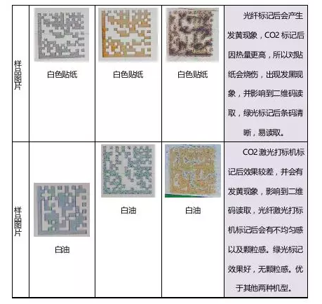 4)對于白油以及貼紙而言,因光纖相比較綠光而言熱量過高,所以激光標(biāo)記在白紙上后會產(chǎn)生發(fā)黃現(xiàn)象,而CO2因為熱量更高,所以標(biāo)記在白紙上后會直接發(fā)黑,影響到二維碼讀取。