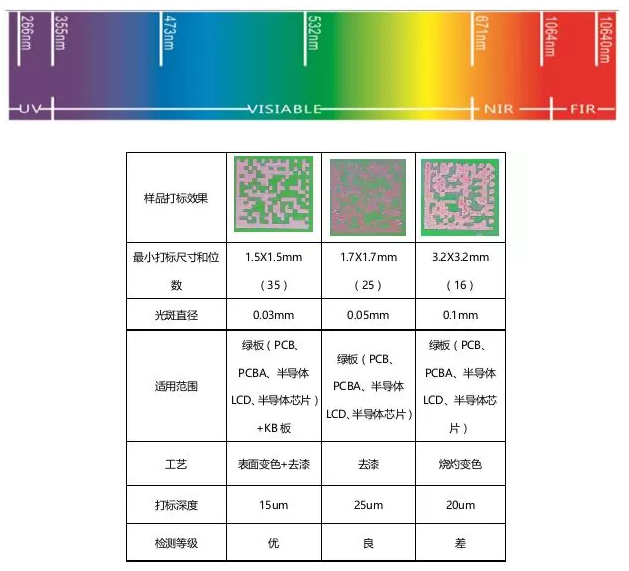 2)綠光激光打標(biāo)機在二維碼可讀碼位,可讀大小的選擇范圍,以及標(biāo)記外觀上都要優(yōu)于其他兩種機型。