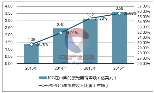 中國激光器市場規(guī)模大、增速快。面對日益增長的激光器市場需求,國內激光器生產企業(yè)紛紛加大研發(fā)和生產力度,但由于國產產能不足以及產品品質差異,國內企業(yè)從歐美進口激光器的數量不斷增加。例如:IPG 為全球知名光纖激光器企業(yè),其在中國市場銷售額和占比均呈逐年增長態(tài)勢。2013-2016 年,IPG在中國市場銷售額數據如下: