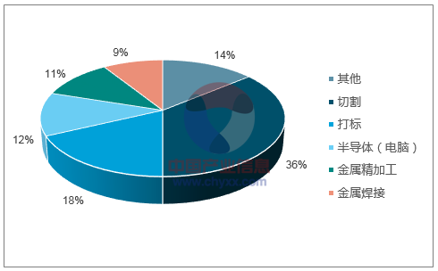 以工作物質分類,工業(yè)激光器可以分為光纖激光器、CO2 激光器、固體激光器和其他激光器,其中,光纖激光器在材料加工領域占比最高。2016 年,全球光纖激光器銷售額為 13.05 億美元,占工業(yè)激光器銷售額的 41.34%。光纖激光器市場規(guī)模的快速增長系工業(yè)激光器市場規(guī)模增長的主要原因。在材料加工方面,工業(yè)激光器主要用于切割、打標、金屬精加工、金屬焊接等,其中,切割和打標為最重要的兩個應用領域。2016 年,全球工業(yè)激光器在材料加工方面的應用中,切割應用占 36%,打標應用占 18%。具體情況詳見下圖: