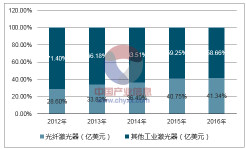 同時,光纖激光器在工業(yè)激光器中的市場份額保持逐年上升,從2012年的28.60%增加至 2016 年的41.34%, 成為市場份額最大的工業(yè)激光器。 2012-2016年,光纖激光器市場份額如下圖: