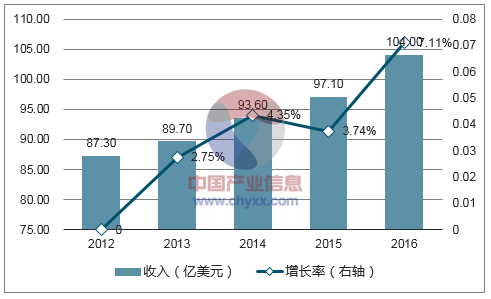 發(fā)展中國家在制造業(yè)升級過程中,逐步使用激光設備代替?zhèn)鹘y(tǒng)設備,對激光器的需求旺盛,系目前全球激光行業(yè)市場最主要的驅動力之一。根據報告,2012-2016 年,全球激光器行業(yè)收入規(guī)模持續(xù)增長,從2012年的 87.30 億美元增加至 2016 年的 104.00 億美元,年復合增長率為 4.47%。隨著大功率激光器技術突破和增材制造技術的成熟, 預計未來激光器行業(yè)將持續(xù)快速增長。2012-2016 年,全球激光器行業(yè)收入如下圖所示: