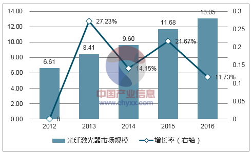 全球光纖激光器收入從 2012年的 6.61 億美元, 增加至 2016年的 13.05 億美元,年復合增長率為18.54%,保持快速增長態(tài)勢。2012-2016 年,光纖激光器市場規(guī)模如下圖: