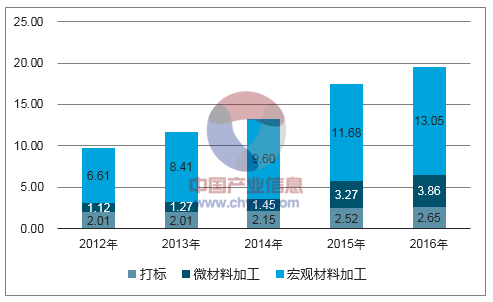 根據報告, 光纖激光器的用途可以為打標、微材料加工(Micro Processing) 、宏觀材料加工(Macro Processing)三大類。其中, 微材料加工包括了除打標以外, 所有輸出功率小于 1,000W 的激光器應用;宏觀材料加工包括了所有輸出功率大于等于1,000W 的激光器應用, 主要為金屬切割和焊接。近年來,光纖激光器市場規(guī)模保持增長,其中,用于宏觀材料加工的激光器市場規(guī)模增長迅速,從 2012 年的 3.49 億美元增加至 2016 年的 6.53億美元,年復合增長率為 16.96%;用于打標的光纖激光器市場規(guī)模從 2012 年2.01 億美元增長至 2016 年的 2.65 億美元,年復合增長率為 7.16%;用于微材料加工的光纖激光器市場規(guī)模從 2012 年的 1.12 億美元增加至 2016 年的 3.86億美元,年復合增長率為36.25%。2012-2016 年,光纖激光器用途分類如下圖所示: